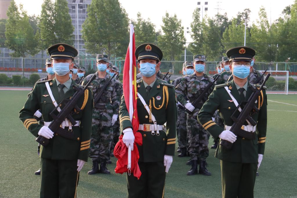 仪式上,国旗护卫队扛旗在肩,迈着坚定有力的步伐走向升旗台;师生高唱国歌,注视着五星红旗冉冉升起,飘扬在校园上空。在特殊时期,这一幕让人更加激动、非比寻常。