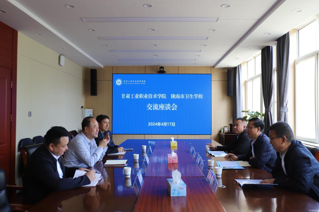 为落实甘肃省教育厅等九部门关于印发《加快推进全省现代职业教育体系建设改革的实施意见》通知精神,探讨“3+2”中高职分段衔接、五年一贯制中高职贯通人才培养衔接,推动职业教育高质量发展,4月17日上午,陇南市卫生学校校长张谦明一行4人,来我校对接中高职联合办学事宜。双方召开座谈交流会,副院长周晓明出席,招生就业处负责人等参加。