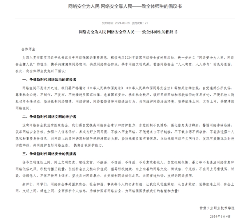 学校各相关部门高度重视,统筹协调,通过在学校官方网站、微信公众号发布网络安全倡议书,号召全体师生进一步树立“网络安全为人民,网络安全靠人民”的理念,携手共建清朗网络空间,共筑网络安全防线,营造网络安全“人人有责,人人参与”的良好氛围。