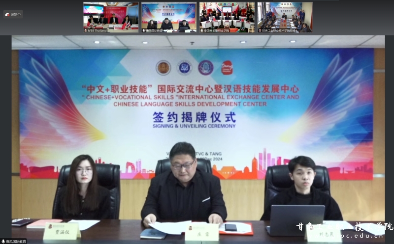 在热烈的掌声中,甘肃工业职业技术学院与泰国曼谷职教中心、吞武里职业学院、唐风国际教育集团四方共同签署项目合作框架协议。与会领导嘉宾共同在线上为“中文+职业技能”国际交流中心和“汉语技能发展中心”揭牌。