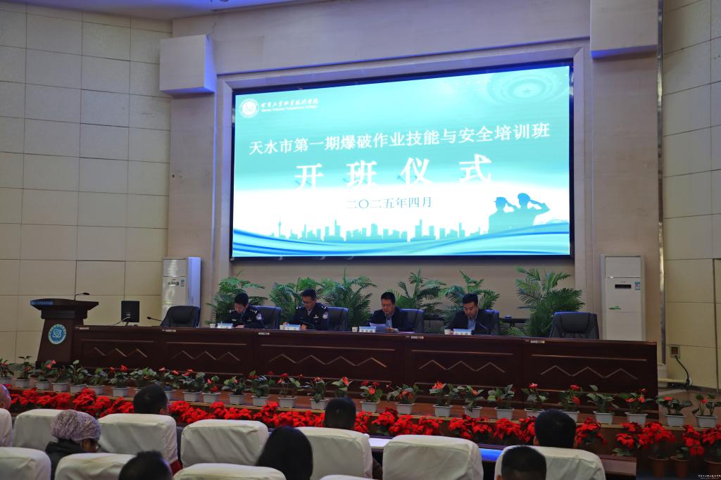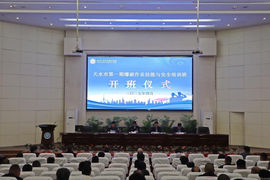 为进一步提升爆破作业人员的专业技能和安全意识,规范民用爆炸物品管理,保障安全生产,4月16日上午,由天水市公安局主办,甘肃工业职业技术学院、天水天强民爆高科技有限公司承办的“天水市2025年第一期爆破作业技能与安全初次培训班”在我校顺利开班。天水市公安局党委委员、副局长张涛,市公安局治安支队队长曹勇,天水天强民爆高科技有限公司经理白玉锋出席开班仪式,我校党委委员、纪委书记、监察专员贾昌麟出席开班仪式并致开幕词。