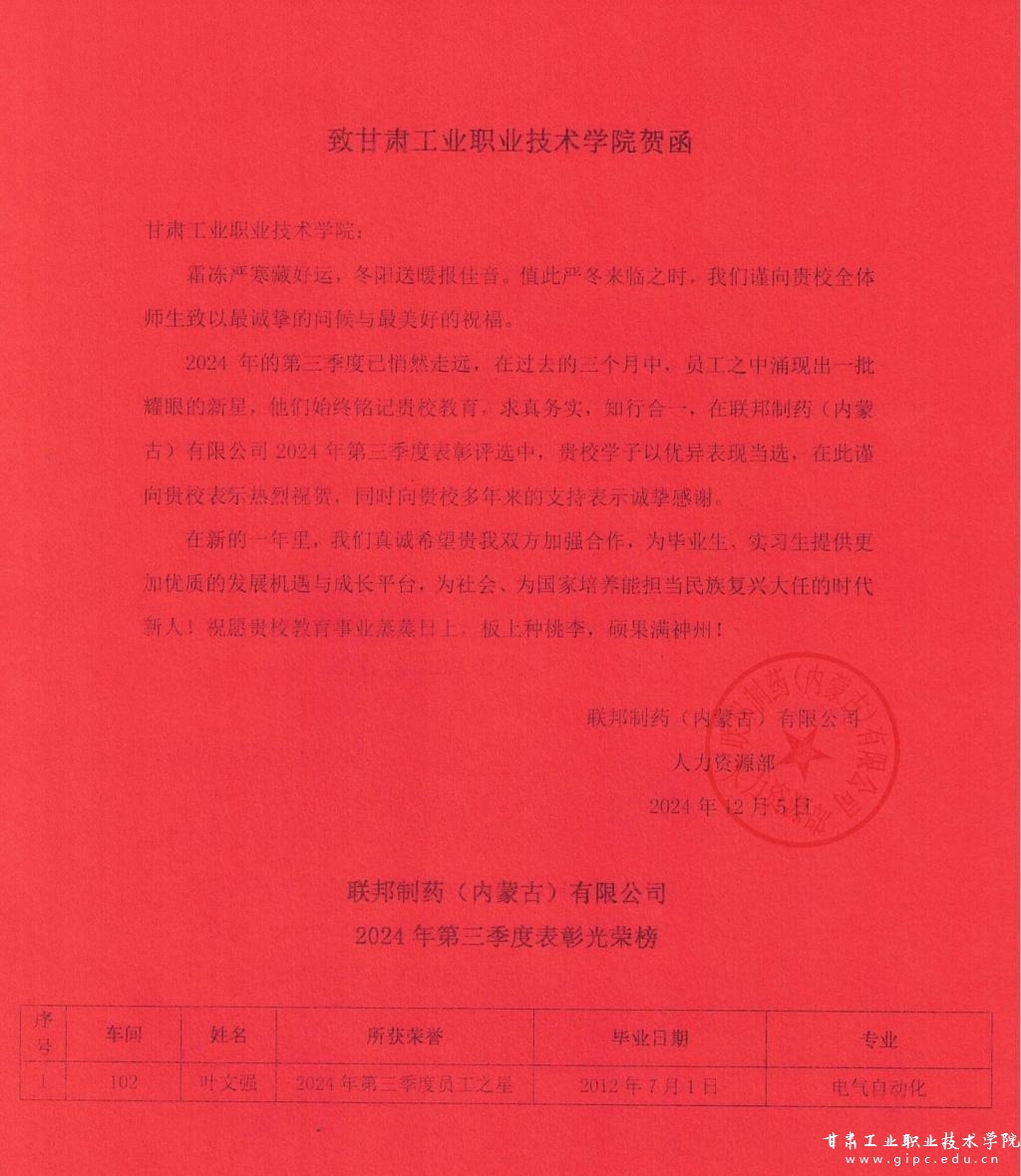 近日,我校智能制造学院传来喜讯,2012届电气自动化技术专业毕业生叶文强在职业生涯中取得了新的突破,荣获联邦制药(内蒙古)有限公司2024年度第三季度“员工之星”称号。这一荣誉不仅是对叶文强个人努力的肯定,也是对我校教育教学质量的认可。