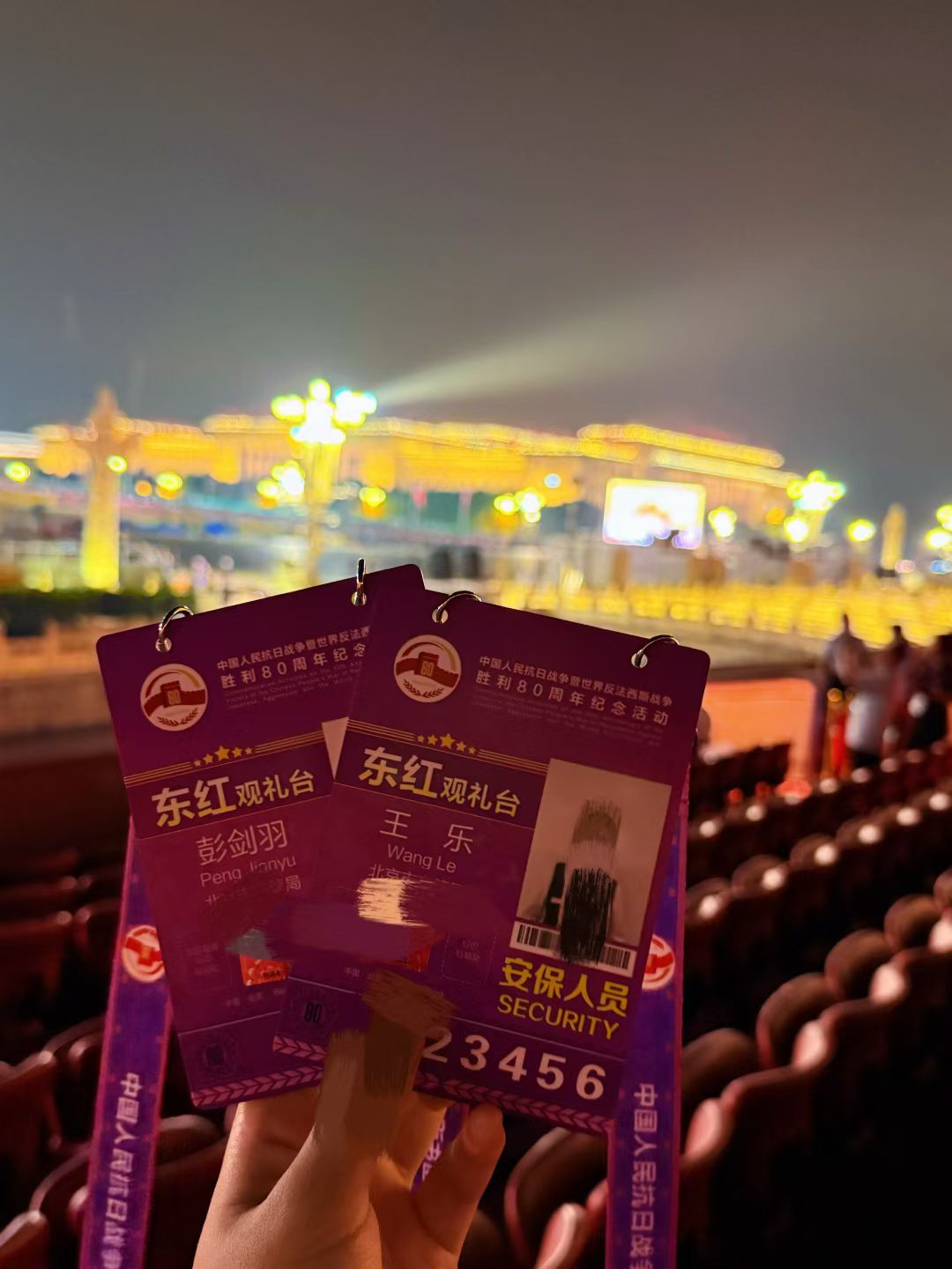 在抗战胜利80周年阅兵礼仪人员的选拔过程中,王乐同学凭借扎实的专业基础、优雅的仪态举止和过硬的政治素质,历经层层选拔最终获选,被确定为观礼台安保人员,承担了这一具有重大历史意义的礼宾和安保任务。
