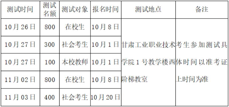 根据甘肃工业职业技术学院语言文字培训测试站2024年工作计划,下半年测试工作将于10月1日正式开始。为使测试工作的报名、现场测试、成绩查询及证书领取等工作环节科学、规范,现就具体事宜通知如下。