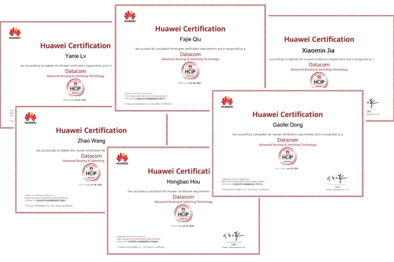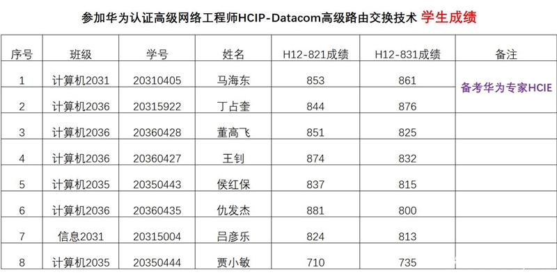 2022年6月26日-7月1日,我校电信学院计算机应用技术专业8名同学参加华为认证高级网络工程师HCIP-Datacom考试,并取得华为高级网络工程师认证证书。