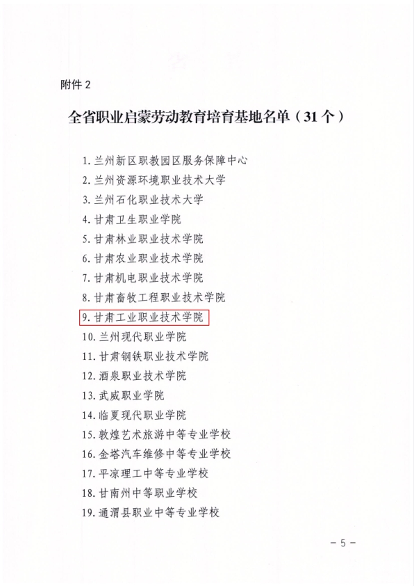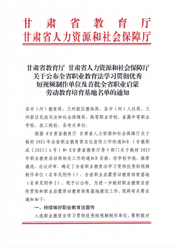 日前,甘肃省教育厅、甘肃省人力资源和社会保障厅发布了《关于公布全省职业教育法学习贯彻优秀短视频制作单位及首批全省职业启蒙劳动教育培育基地名单的通知》,我校经过一系列严格的审核与筛选,成功入选首批甘肃省职业启蒙劳动教育培育基地。