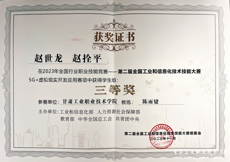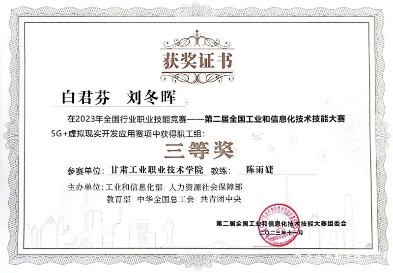 11月15日—18日,2023年全国行业职业技能竞赛——第二届全国工业和信息化技术技能大赛决赛在浙江省绍兴市举办。经过理论考试和实践操作环节的激烈角逐,我校电信学院教师白君芬、刘冬晖,学生赵世龙、赵拴平分别荣获5G+虚拟现实开发应用赛项职工组三等奖和学生组三等奖,为甘肃代表队和学校争得了荣誉。
