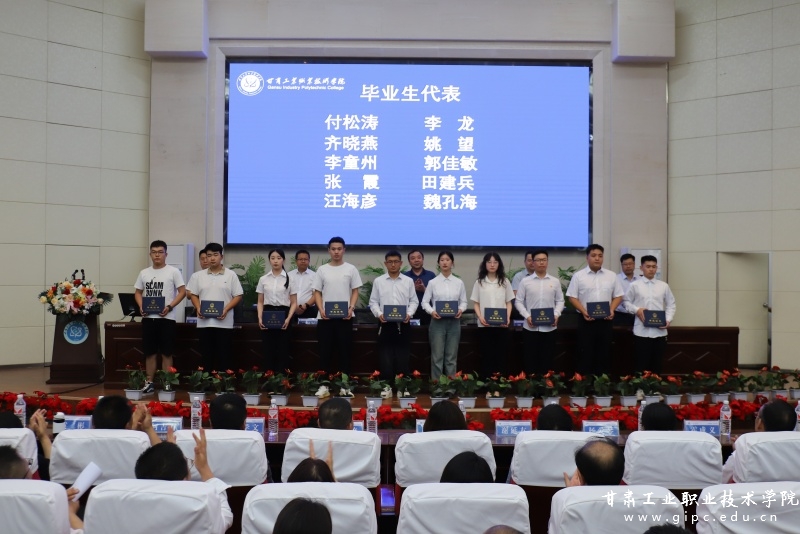 副院长曹惠清宣读《2024届甘肃省普通高等学校优秀毕业生名单》《甘肃工业职业技术学院2024届优秀毕业生名单》,学校领导分别为优秀毕业生代表颁发了荣誉证书,为毕业学生代表颁发了毕业证书。