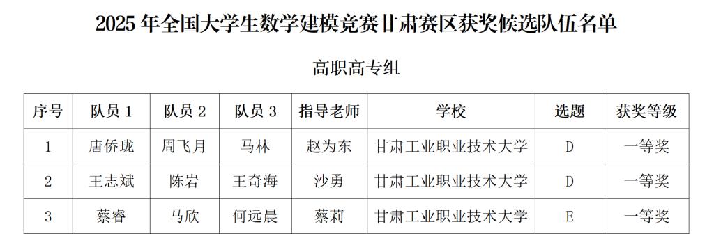 近日,2025年“高教社杯”全国大学生数学建模竞赛甘肃赛区获奖名单正式公布,我校学子凭借扎实的数学理论功底、出色的创新思维与高效的团队协作,荣获高职高专组甘肃赛区一等奖3项。