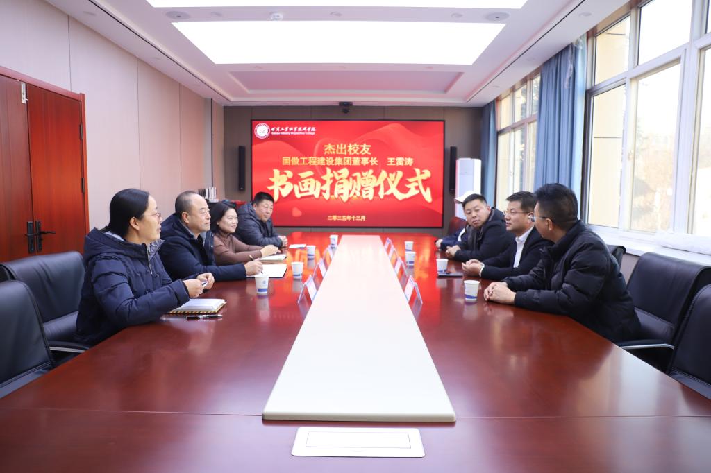 仪式上,周晓明代表学校向王雷涛校友重返母校表示诚挚欢迎,并对其长期以来关注和支持学校发展表示衷心感谢。他指出,王雷涛校友毕业后,脚踏实地、奋发进取,在工程建设、文化教育及企业管理等多个领域取得显著成绩,是母校人才培养成果的生动体现,也为在校学生树立了良好榜样。他强调,校友是学校最宝贵的财富和最生动的名片,学校的发展离不开广大校友的关心与支持。此次捐赠既承载着校友对母校的深厚情感,也彰显了校友积极参与校园文化建设的责任感。学校将妥善收藏并展示这份情谊深厚的礼物,使其成为维系校友情感、传承学校精神的文化纽带。