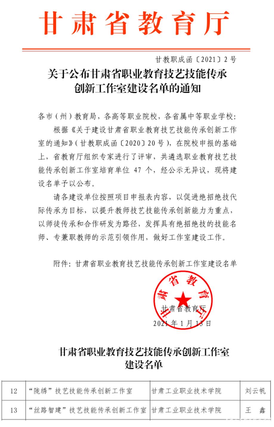 近日,甘肃省教育厅发布《关于公布甘肃省职业教育技艺技能传承创新工作室建设名单的通知》,我校刘云帆老师负责的“陇绣”技艺技能传承创新工作室和王鑫老师负责的“丝路智建”技艺技能传承创新工作室经过层层评选成功获批。