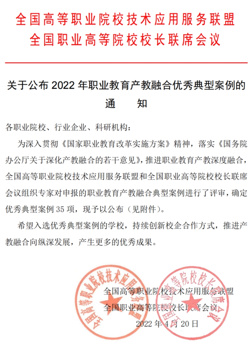 近日,全国高等职业院校技术应用服务联盟和全国职业高等院校校长联席会议公布了2022年职业教育产教融合优秀典型案例名单,我校报送的《产教深度融合下的高职校企合作模式探索——以甘肃工业职业技术学院和三和数码测绘地理信息技术有限公司为例》成功入选。这是我校在“双高”建设中取得的又一重要建设成果。