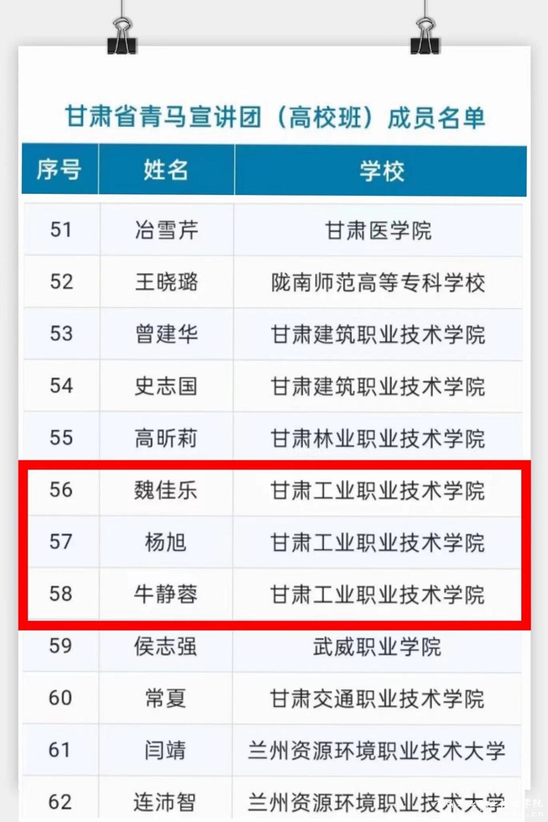 为深入学习贯彻习近平新时代中国特色社会主义思想,认真贯彻落实习近平总书记关于青年工作的重要思想,落实《甘肃省中长期青年发展规划(2018-2025)》和《甘肃省深入实施青年马克思主义者培养工程方案》,坚持用马克思主义科学理论武装青年头脑,组织引导青年在中国特色社会主义实践、群众工作实践、各种重大事件和急难险重任务中,深入了解世情国情党情,站稳立场、坚定信念、锻炼能力、敢于担当,充分发挥“点亮一盏灯、照亮一大片”的示范带动作用,奋力谱写全面建设社会主义现代化幸福美好新甘肃壮丽青春篇章,以实际行动迎接党的二十大胜利召开!经选拔推荐,确定省内各高校共73名同学为甘肃省青马宣讲团(高校班)成员。我校入选名单如下: