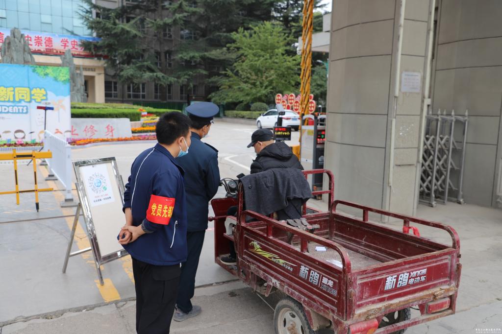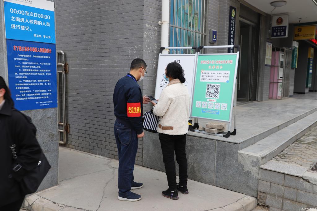 旗帜引领方向,先锋凝聚力量。党员先锋队由各支部书记带队,党员教师坚持24小时轮流值守,协助保卫处做好东西大门进入校园人员两码一报告查验及测温等工作。值守期间,确保“逢进必扫、逢扫必验、不漏一人”,对外来人员和车辆进行排查,对未严格落实防疫要求人员进行劝导,将疫情防控各项举措抓出成效、落到实处。