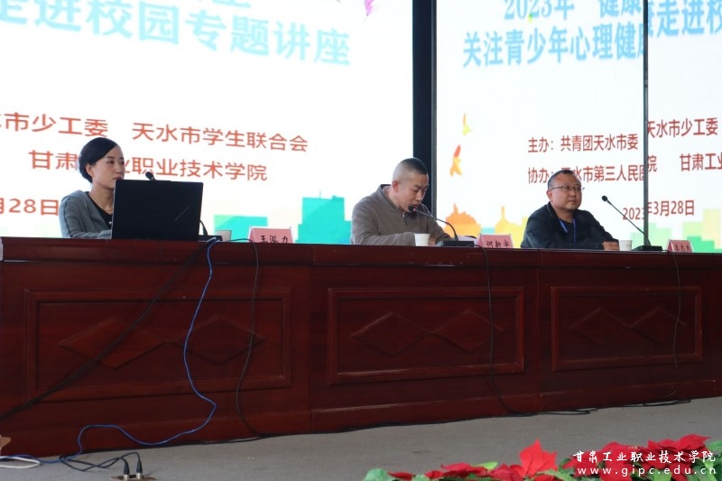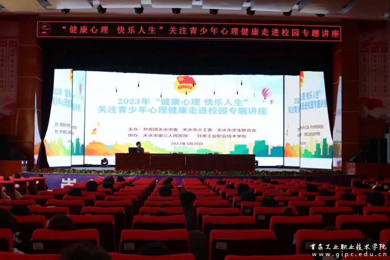 为全面加强我校学生心理健康教育,提高学生心理素质和道德水平, 3月28日,由团市委、市少工委、市学生联合会主办、天水市第三人民医院、甘肃工业职业技术学院协办的2023年“健康心理、快乐人生”——关注青少年心理健康走进校园专题讲座在我校大学生活动中心举行。