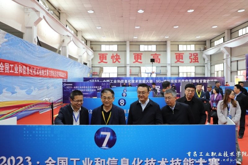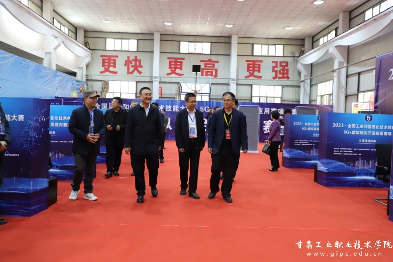 10月28日上午,2023年全国工业和信息化技术技能大赛5G+虚拟现实开发应用赛项甘肃选拔赛在我校体育馆举行。省工信厅党组成员、副厅长黄宝荣,省人社厅二级巡视员李维,省教育厅二级巡视员任全春,省总工会党组成员、副主席马应宏,团省委组织部一级调研员杨成等莅临比赛现场检查指导大赛。校党委书记坚葆林,副院长胡森林、王利军及相关部门负责人陪同检查。