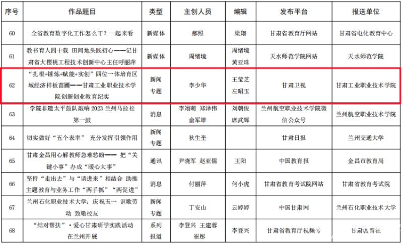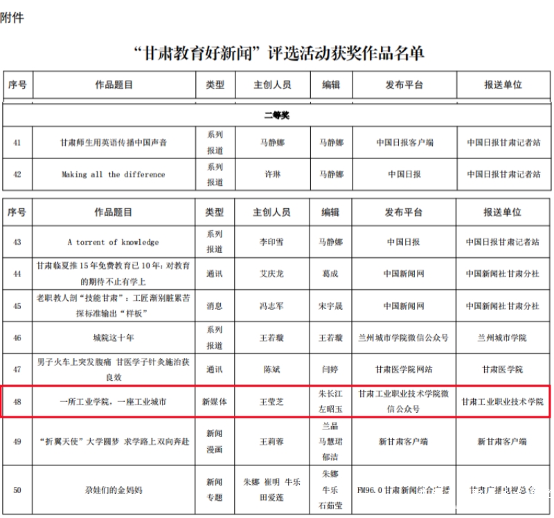近日,中共甘肃省委教育工作委员会公布了“甘肃教育好新闻”评选活动获奖名单。我校报送的新闻作品《一所工业学院,一座工业城市》(发布于学校官方微信公众号)《“扎根+锤炼+赋能+实创”四位一体培育区域经济样板苗圃——甘肃工业职业技术学院创新创业教育纪实》(发布于甘肃卫视)获评二等奖。