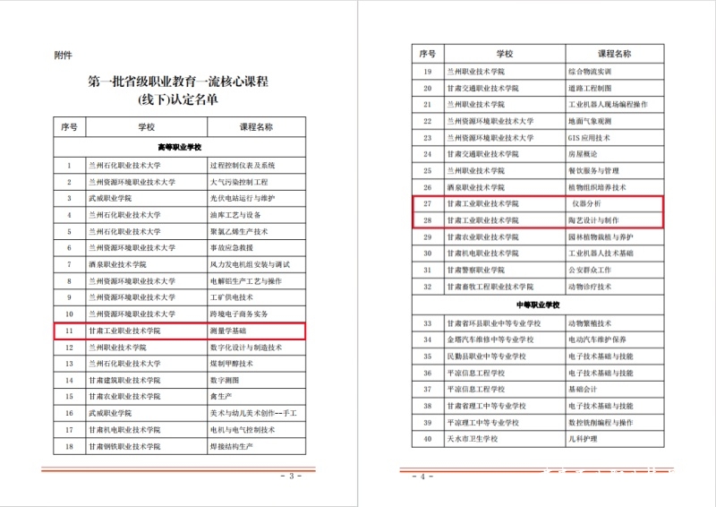 目前已有《测量学基础》《仪器分析》《陶艺设计与制作》等3门课程入选第一批省级职业教育一流核心课程名单。华为ICT工程师一体化认证培养基地、“产教融合”模式的摄影测量创新应用实践、“陇味·甘货”校企合作典型生产实践项目等三个项目入选第一批省级校企合作典型生产实践项目名单。