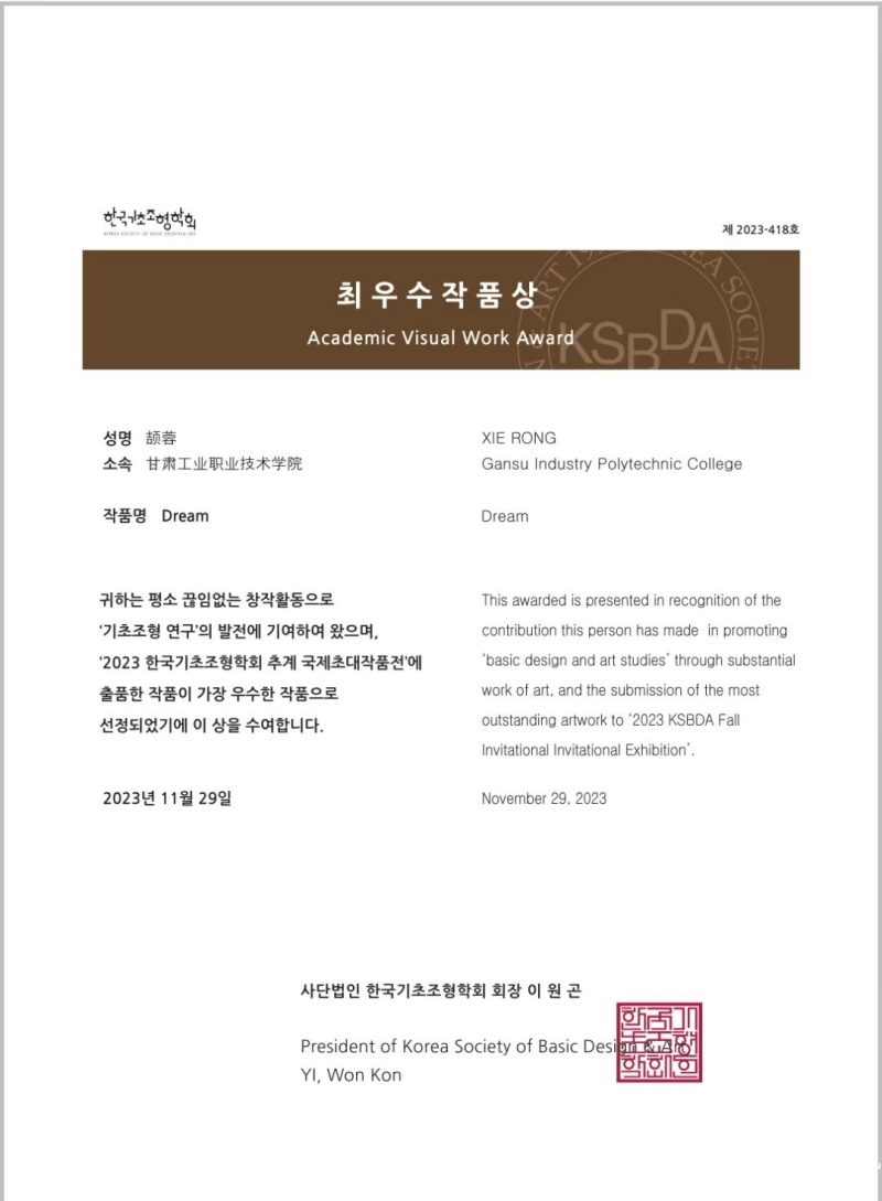 韩国基础设计学会(KSBDA)秋季国际会议暨邀请展览聚集了来自世界各地的艺术家和设计师,是一个展示创新艺术和设计的国际平台。我校教师的获奖不仅是对创作者艺术才华的肯定,也是我校艺术学院办学实力的体现,更为中韩文化交流做出了重要贡献。学校将积极鼓励优秀教师参加国际活动,为世界不断呈现东方艺术的魅力。