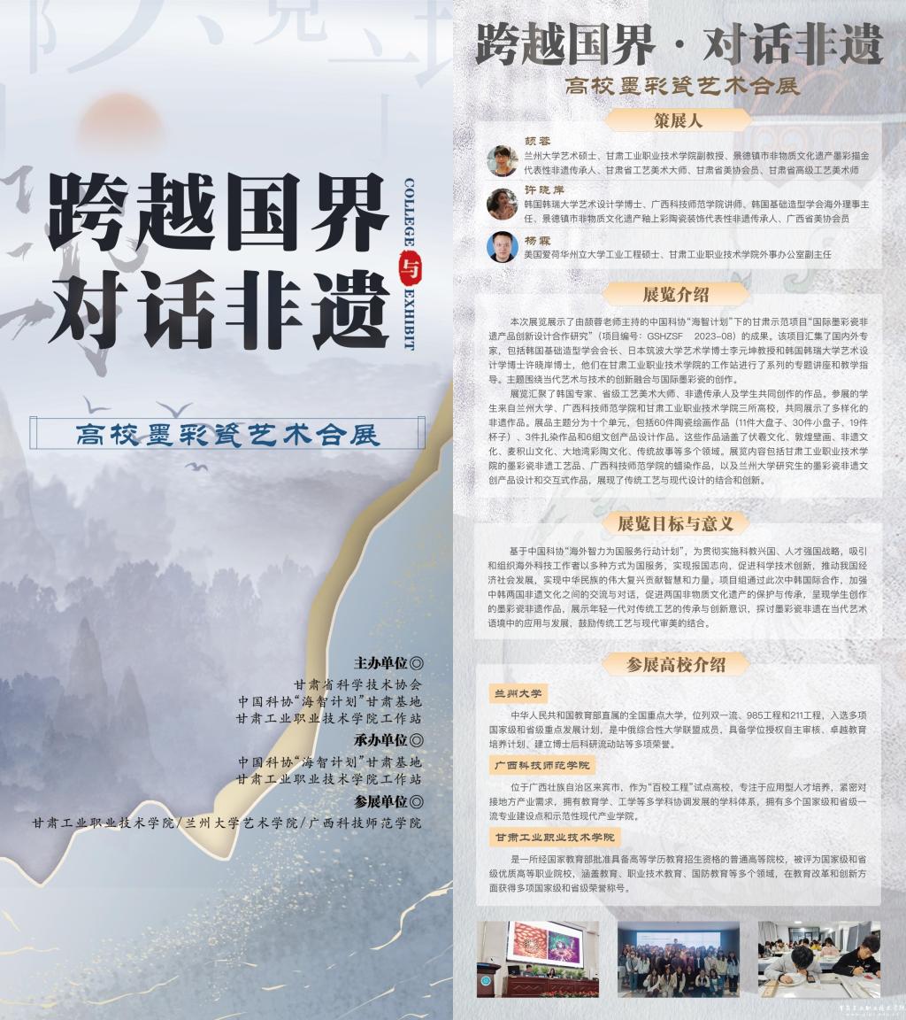 “跨越国界·对话非遗:高校墨彩瓷艺术合展”是艺术学院工艺美术品设计专业教师颉蓉主持的中国科协“海智计划”甘肃海智计划示范项目——“国际墨彩瓷非遗产品创新设计合作研究”的成果。