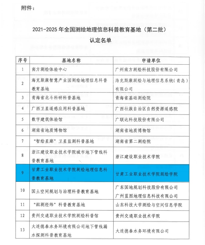 近日,中国测绘学会发布通知,正式命名“南方测绘体验中心”等25家单位为2021-2025年全国测绘地理信息科普教育基地,“甘肃工业职业技术学院测绘地理信息科普教育基地”成功入选,填补了我校在国家级科普教育基地建设领域的空白。