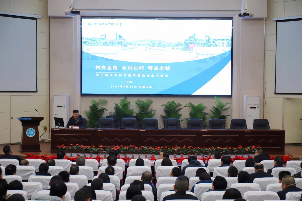 南京工业职业技术大学发展规划处处长、本科职业教育试点办公室主任、副研究员王博作了题为《转变思路 全员协同 精益求精》的报告。报告分析形势、解读政策,详细讲解了职业本科学校申报的准备工作和相关建议,介绍了南京工业职业技术大学的经验做法,为我校做好相关工作注入了新的活力。
