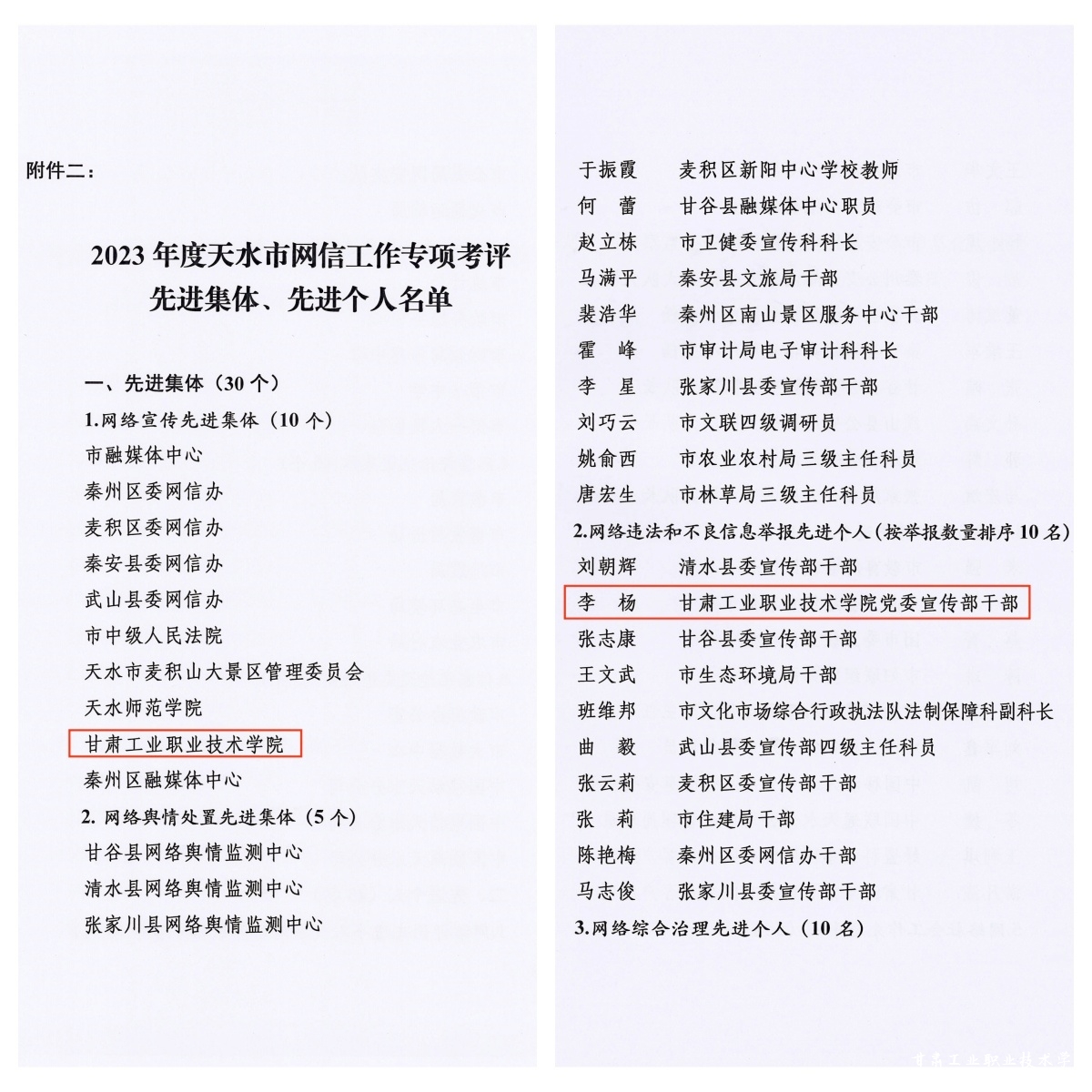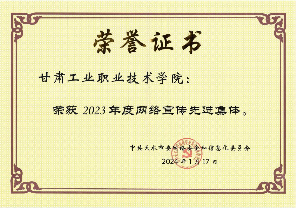 近日,中共天水市委网络安全和信息化委员会印发《关于表彰2023年度全市网信工作综合考评优秀县区、先进集体和专项考评先进集体、先进个人的决定》,我校荣获2023年度网络宣传先进集体,党委宣传部李杨同志荣获先进个人。