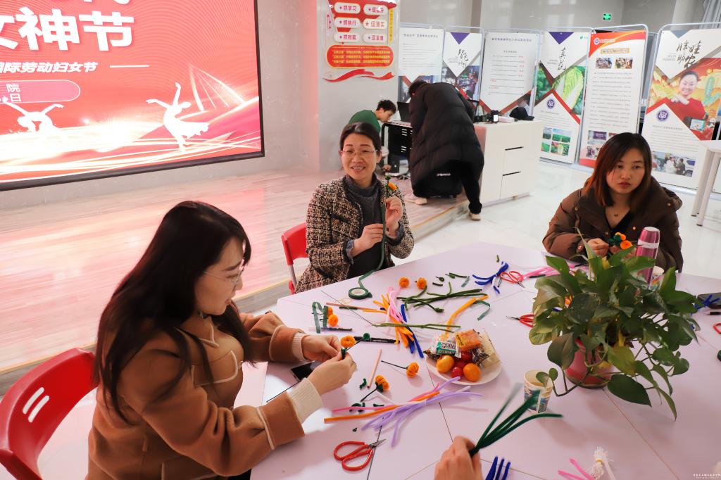 3月8日下午,由校工会和双创学院共同举办的“巾帼建功新时代、巧手共度女神节”庆祝“三八”妇女节绒花手工制作活动在双创学院三楼举行。