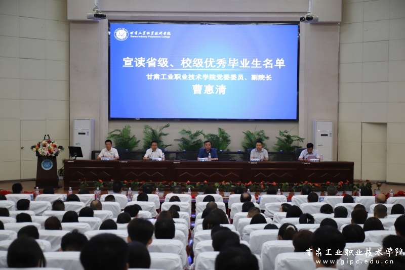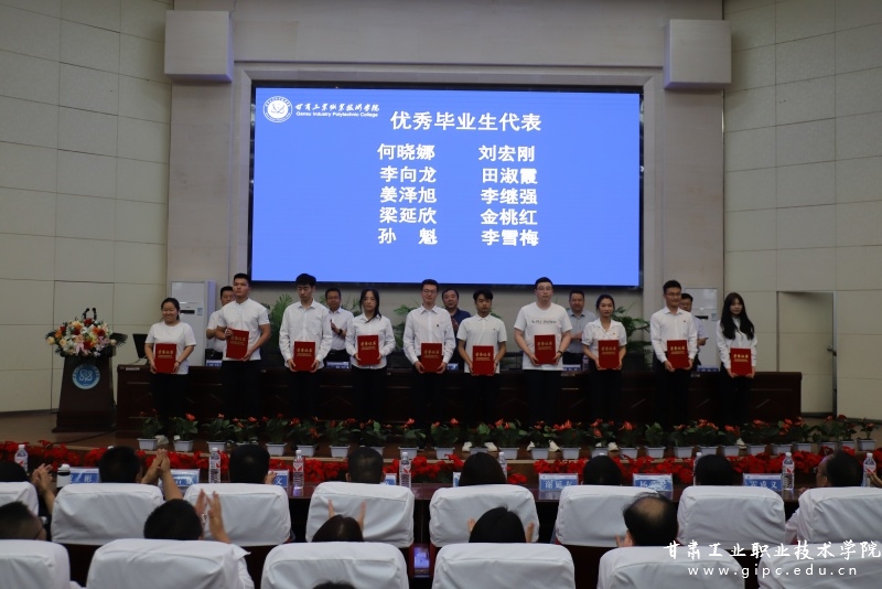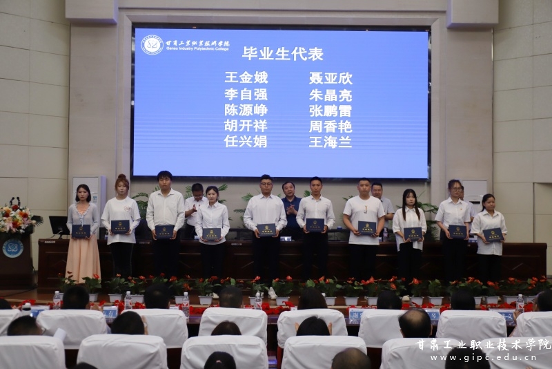 副院长曹惠清宣读《2024届甘肃省普通高等学校优秀毕业生名单》《甘肃工业职业技术学院2024届优秀毕业生名单》,学校领导分别为优秀毕业生代表颁发了荣誉证书,为毕业学生代表颁发了毕业证书。