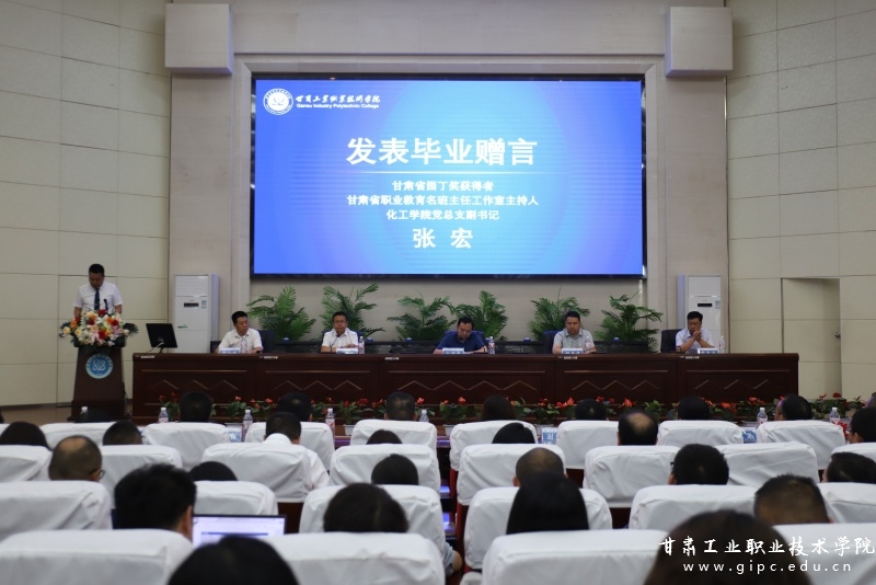 化工学院党总支副书记张宏代表全体教职工作毕业赠言,将学习探索、人生智慧、品德修养、团队协作、健康生活、社会责任六个词赠与毕业生,表达了对他们及其未来工作和生活的真挚祝福和诚挚嘱托。