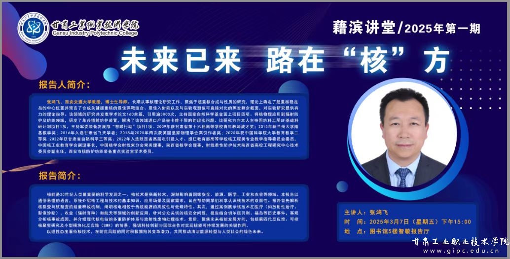 3月7日下午,2025年藉滨讲堂第一期在图书馆五楼智敏报告厅开讲。西安交通大学张鸿飞教授应邀作题为《未来已来,路在“核”方》的专题报告。学校党委委员、副院长周晓明主持报告会,核工程与技术学院、智能制造学院、电子信息学院、化工学院约400余名师生代表现场聆听。