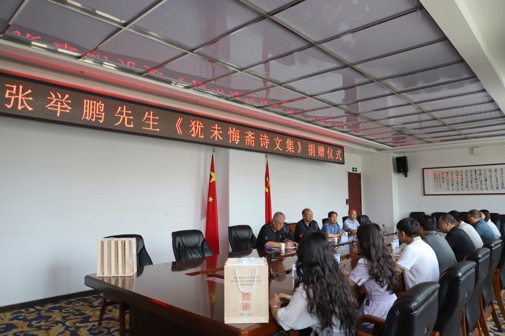 7月16日上午,我校图书馆举行张举鹏先生《犹未悔斋诗文集》捐赠仪式。党委副书记文云,党委委员、副院长周晓明出席活动。天水市诗词学会会长侯金保,张举鹏先生之子、原天水市教育局副局长、天水市职业技术学校校长张笑青及多位嘉宾共同见证。