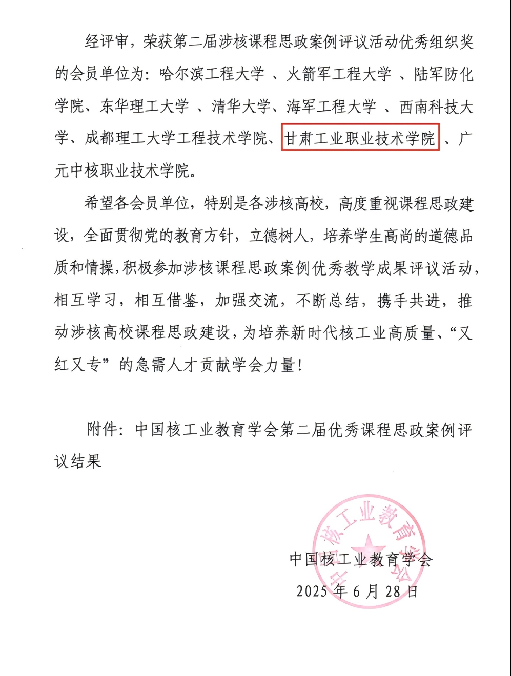 此次获奖是对我校长期深耕涉核领域人才培养和课程思政建设成果的有力肯定。我校与核工业发展有着深厚的历史渊源和紧密联系,获奖案例充分体现了我校将核工业精神、家国情怀与专业教育深度融合的探索与实践成效。