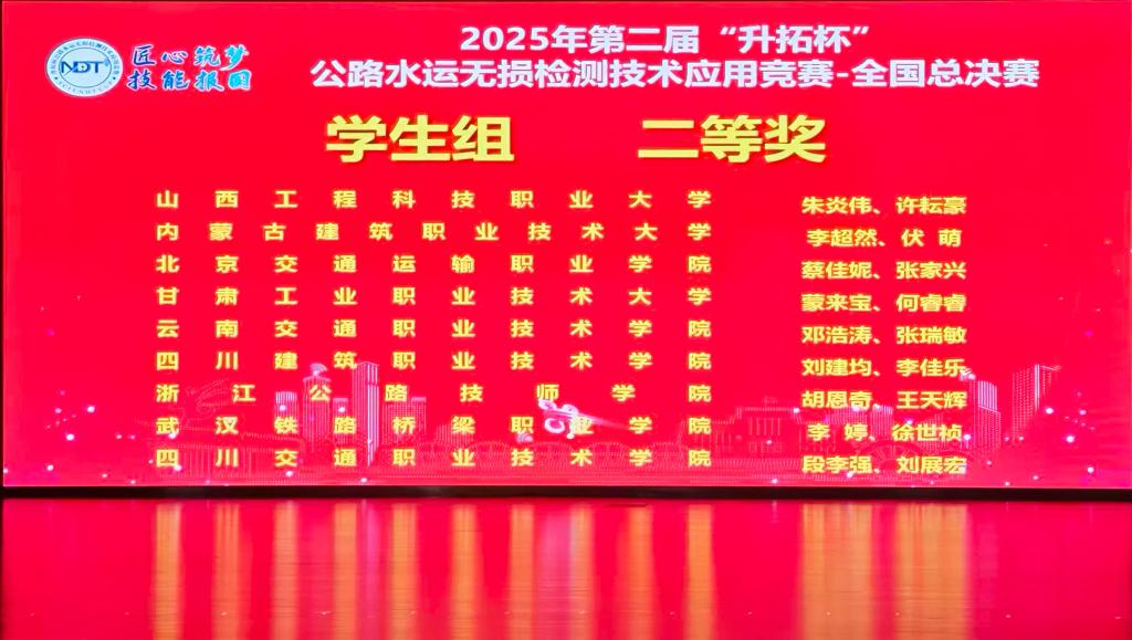 10月11日—15日,2025年第二届“升拓杯”公路水运无损检测技术应用竞赛全国总决赛在甘肃交通职业技术学院成功举办。经过激烈角逐,由我校建筑学院学生蒙来宝、何睿睿组成的参赛队以全国第9名的成绩荣获二等奖。