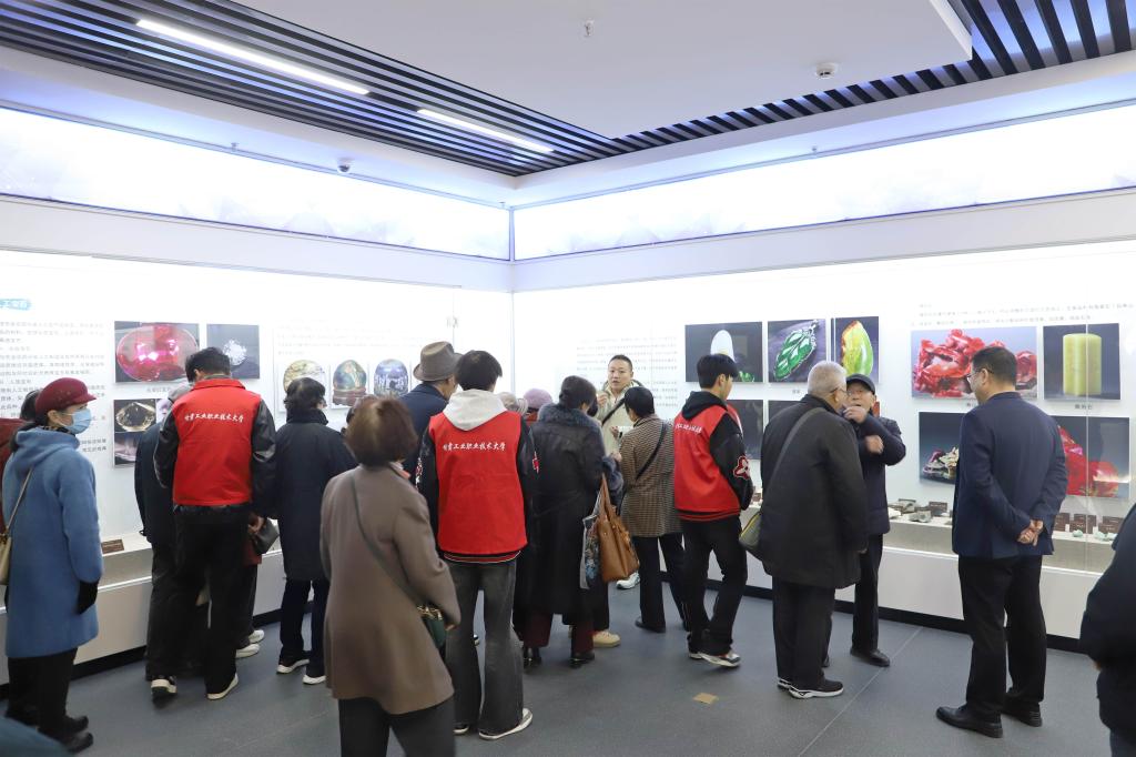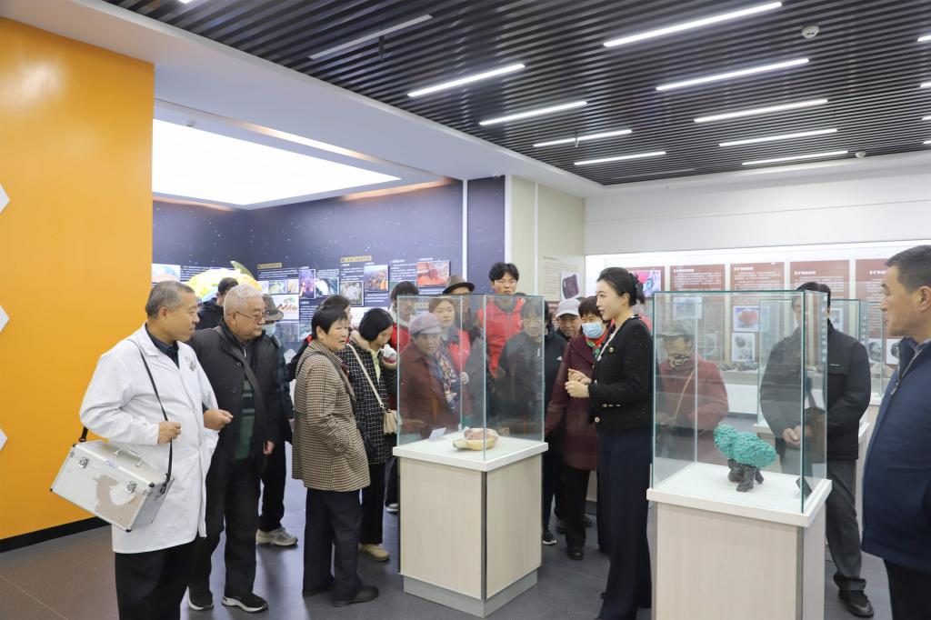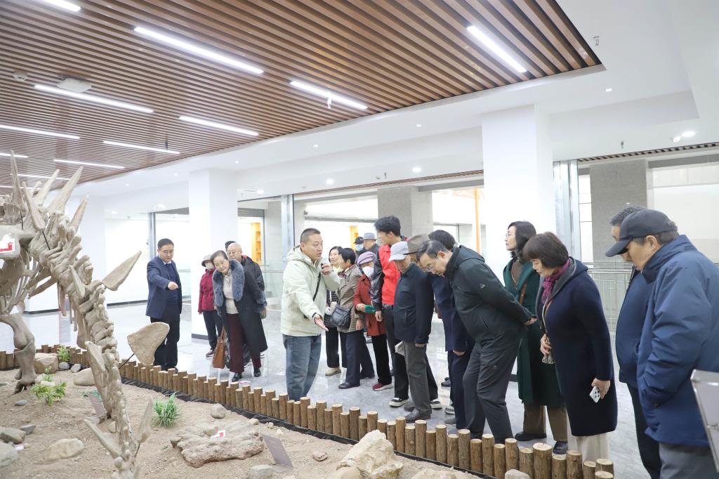 在地质博物馆,一场探索地球奥秘的科普之旅随之展开。矿物岩石展厅中,晶莹剔透的水晶标本、色彩斑斓的矿石藏品令人目不暇接;古生物化石展区内,栩栩如生的恐龙骨架模型与保存完好的三叶虫化石,引发了老同志们的浓厚兴趣。讲解员结合实物,系统阐释了地球演化历程与区域地质变迁,并重点介绍了学校在地矿领域的科研成果及其对行业发展的推动作用,让大家深刻感受到新时代地质精神的丰富内涵和蓬勃生机。