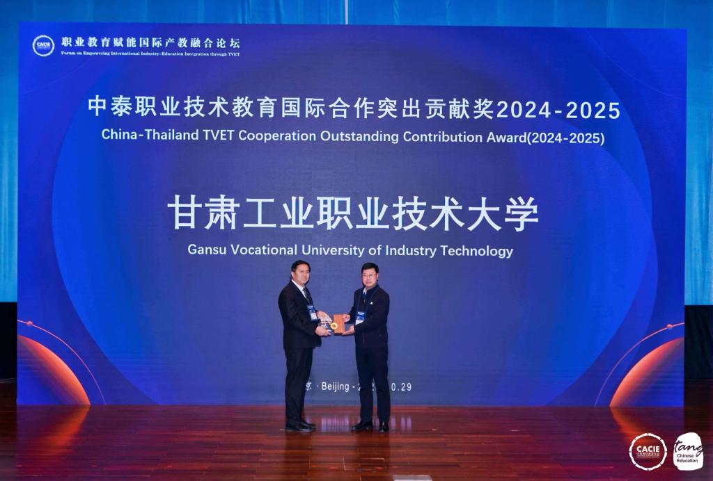 在“职业教育赋能国际产教融合论坛”上,学校荣获“2024—2025中泰职业技术教育国际合作突出贡献奖”。泰国教育部职业教育委员会合作部部长塔纳帕·桑俊亲自为学校颁奖。这表明学校国际化办学获得国际认可,标志着我校与泰国的职业教育合作进入了机制化、实体化的新阶段。