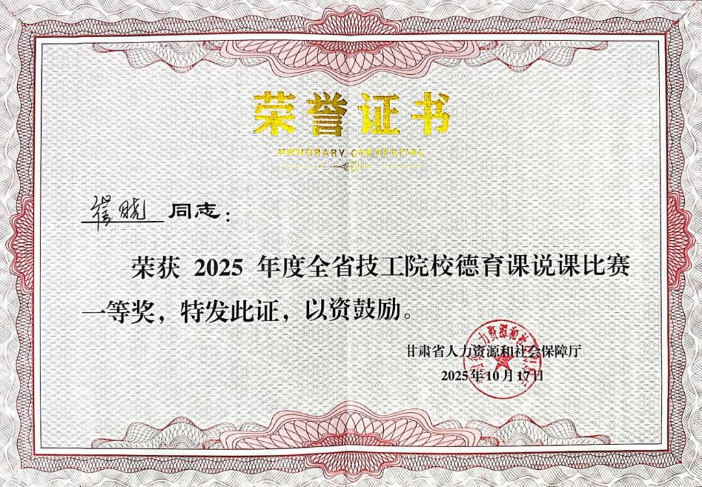 近日,在省人力资源和社会保障厅主办的全省技工院校德育课说课比赛活动中,学校教师崔晓凭借扎实的教学功底、创新的教学设计与深刻的德育理念,从众多参赛选手中脱颖而出,最终以总分第一的成绩荣获一等奖。