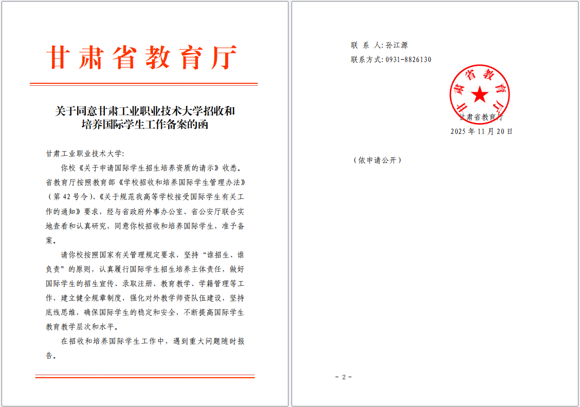 近日,甘肃省教育厅下发《关于同意甘肃工业职业技术大学招收和培养国际学生工作备案的函》,经专家组实地考察验收,我校正式获批招收和培养国际学生资质。该资质的获批,是我校发展史上的一个重要里程碑,标志着办学国际化程度进一步提升,也是对学校办学特色、教育质量及综合实力的认可。