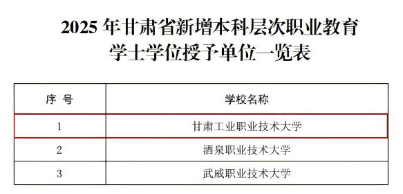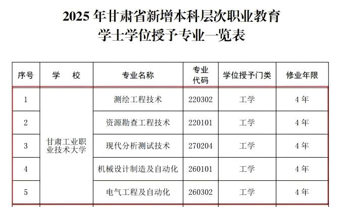 近日,甘肃省学位委员会正式下发通知,批准我校成为本科层次职业教育学士学位授予单位。我校首批五个本科专业——测绘工程技术、资源勘查工程技术、现代分析测试技术、机械设计制造及自动化、电气工程及自动化,全部通过审核,获准增列为学士学位授予专业。这标志着学校正式具备学士学位授予资格,在办学层次和人才培养质量方面实现重要突破。