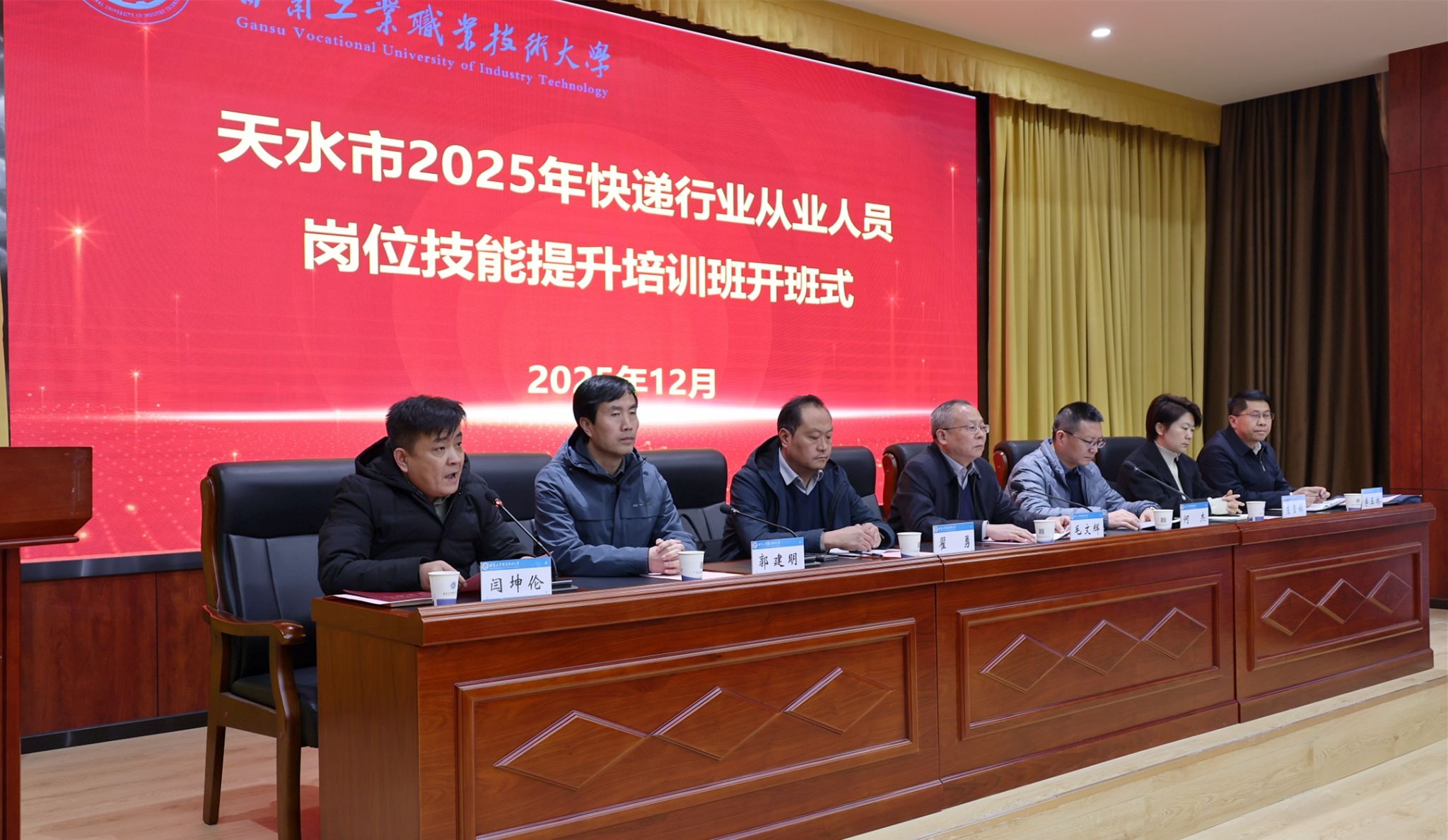 为贯彻落实甘肃省财政厅、人社厅及天水市人社局相关文件精神,切实提升快递行业服务质量与安全水平,推动行业高质量发展,12月30日,2025年天水市快递行业从业人员技能提升培训班在甘肃工业职业技术大学顺利开班。学校党委常委、副校长毛文辉,天水市邮政管理局党组成员、副局长何杰,天水市邮政管理局市场监管科科长庄雪嫔,天水市邮政业安全中心主任翟勇,甘肃工业职业技术大学相关部门负责人出席开班仪式。全市97名快递企业从业人员代表参加培训,开班仪式由财经商贸学院院长闫坤伦主持。