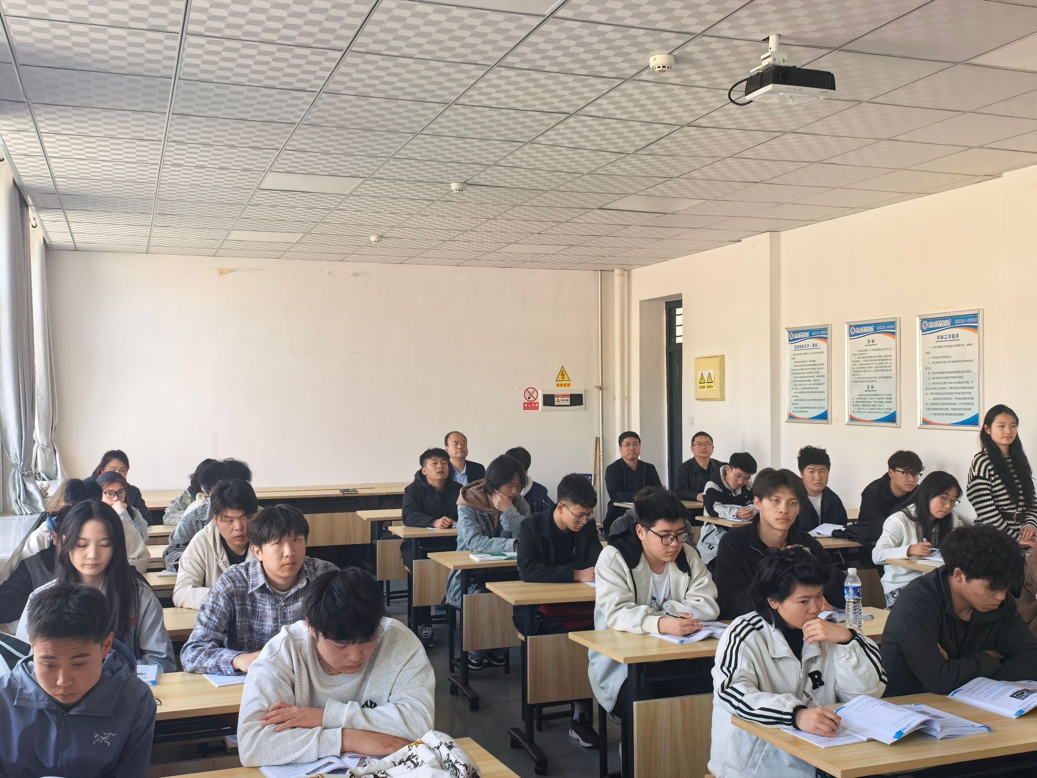 周晓明走进课堂,听取了专任教师何文荣讲授的《房屋构造》课程,认真记录授课重点,细致观察师生互动情况。