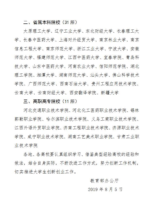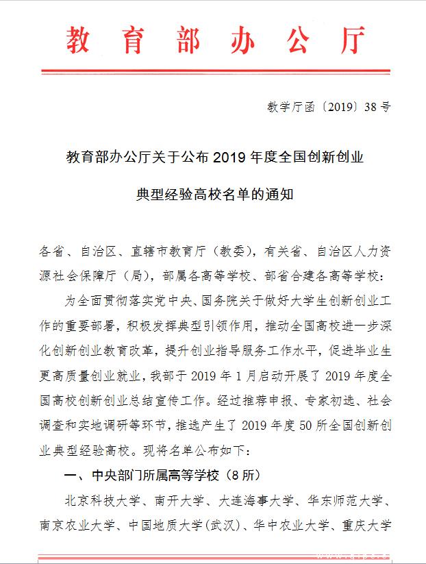 ▲教育部办公厅关于公布2019年度全国创新创业典型经验高校名单的通知》教学厅函〔2019〕38号