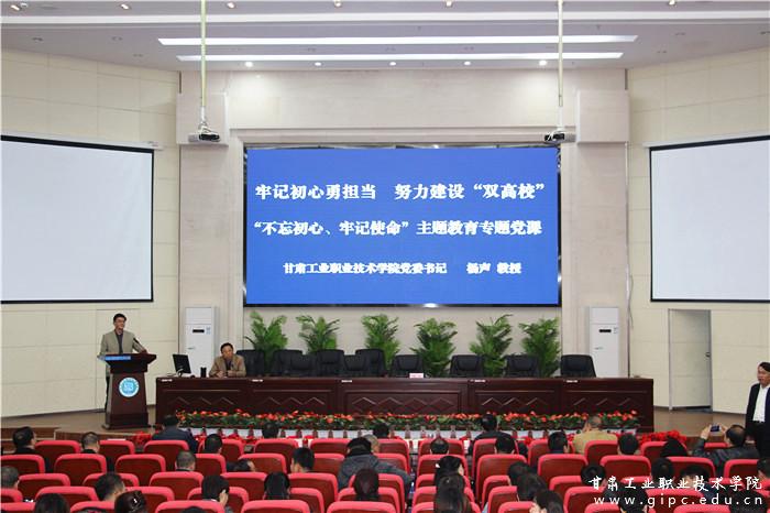 10月23日下午,甘肃工业职业技术学院“不忘初心、牢记使命”主题教育专题党课在学校图书馆五楼报告厅举行,甘肃工业职业技术学院校党委书记杨声作题为《牢记初心勇担当、努力建设“双高校”》的专题党课辅导。省委“不忘初心、牢记使命”主题教育第六巡回指导组海洋同志到场指导。全校党员干部、教师和学生入党积极分子近300人参加了党课学习。