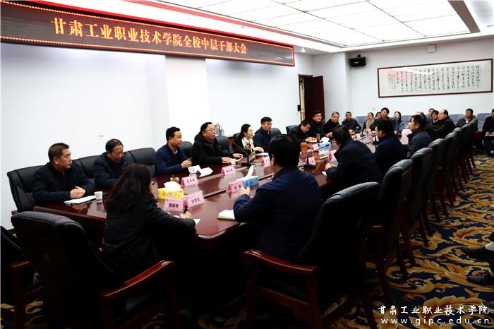 12月18日上午,甘肃工业职业技术学院召开全校中层干部会议,宣布关于潘文生、郭建忠同志职务调整的任免决定。学校领导班子成员、中层干部参加。