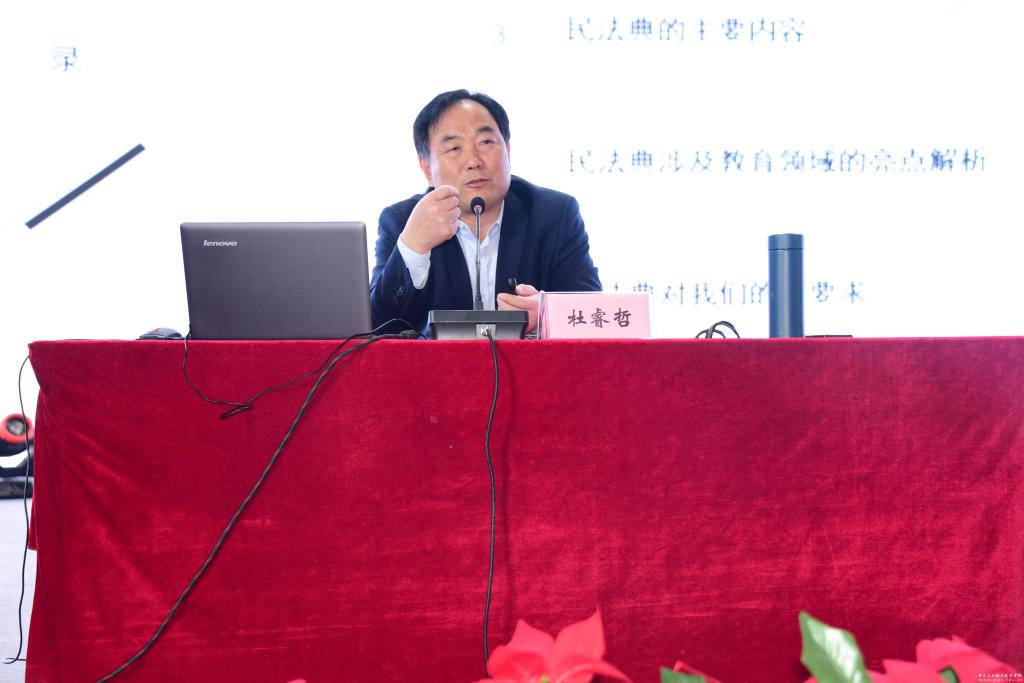 报告会分别从新中国民法典之路、实施民法典的重要意义、民法典的主要内容、民法典涉及教育领域的亮点解析、民法典对我们的新要求等五个方面充分阐释了《中华人民共和国民法典》是一部固根本,稳预期,利长远的基础性法律。宣讲过程中,杜教授结合多年法律工作实际,深度解析了民法典的基本结构及各编之间的关系、基本原则、基本制度等,深刻分析了实施民法典是坚持和完善中国特色社会主义制度的现实需要;是坚持以人民为中心、保障人民权益的现实需要和发展的必然要求;是发展社会主义市场经济,巩固社会主义基本经济制度的必然要求;是推进全面依法治国,推进国家治理体系和治理能力现代化的重大举措。