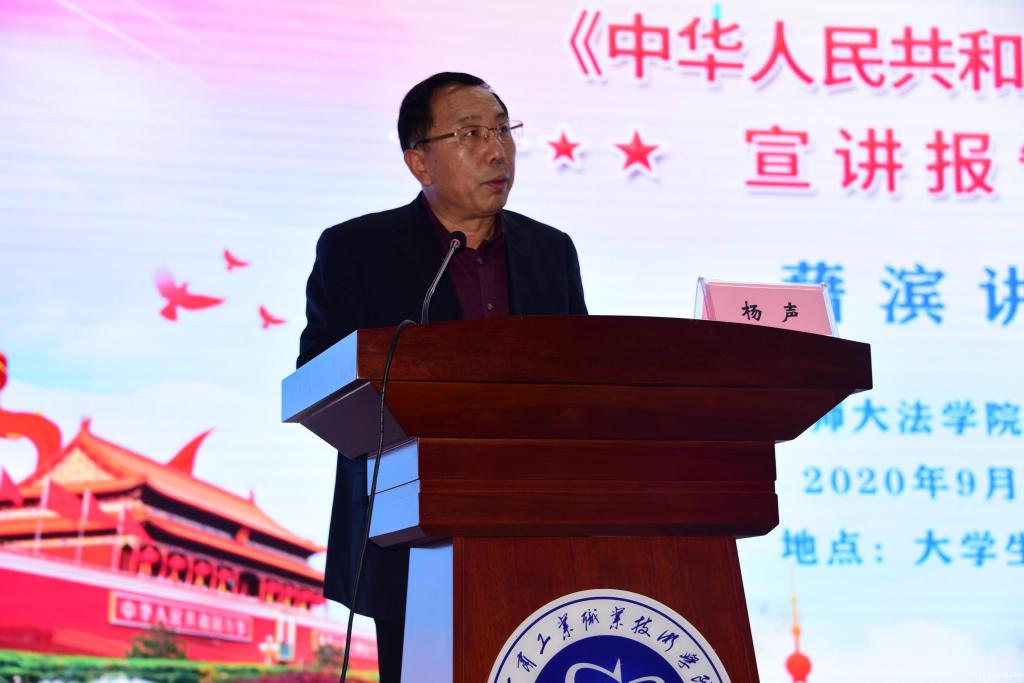党委书记杨声在宣讲报告会主持中指出,《民法典》是我国首部以“法典”命名的法律,开创了我国法典编纂立法的先河,具有里程碑意义。《民法典》在立法中始终坚持人民至上,彰显了中国特色。《民法典》具有完善中国特色社会主义法律体系、促进国家治理体系和治理能力现代化、推动社会规范和法律适用科学化等一系列重要意义。学习、宣传、贯彻、实施好民法典是学校当前和今后一段时间的重大政治任务,各党总支(支部)、各部门要抓紧、抓实、抓到位,切实增强学习贯彻民法典的思想自觉和行动自觉。