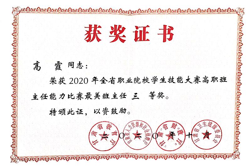 近日, 2020年全省职业院校班主任技能大赛在兰州资源与环境职业技术学院落下帷幕,我校教师高霞在“最美高职班主任”组别比赛中荣获三等奖。