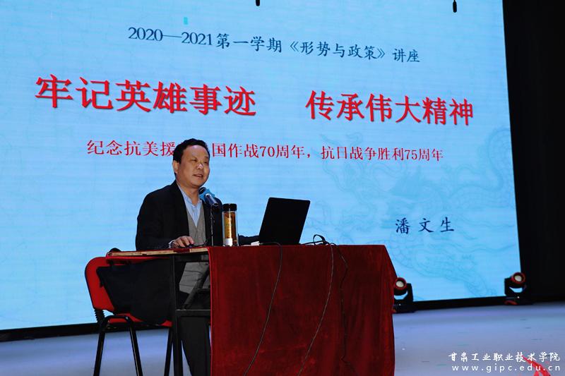 12月1日至10日晚,校纪委书记、监察专员潘文生在大学生活动中心先后5次以“牢记英雄事迹 传承伟大精神——纪念抗美援朝出国作战70周年、抗日战争胜利75周年”为主题,给2020级3500余名新生上了一堂生动的爱国主义专题讲座。