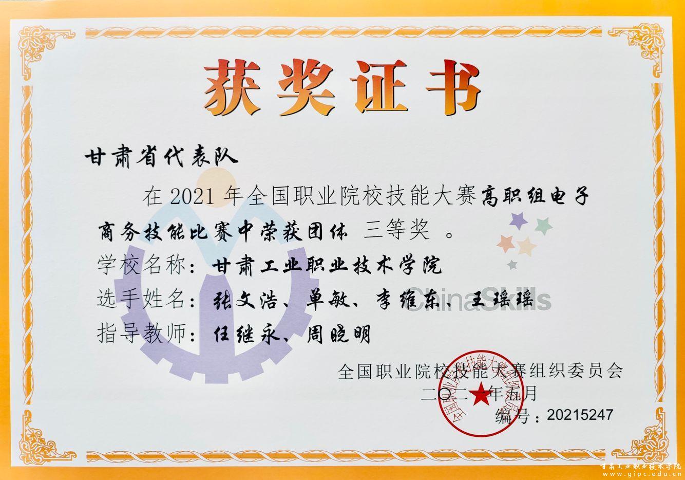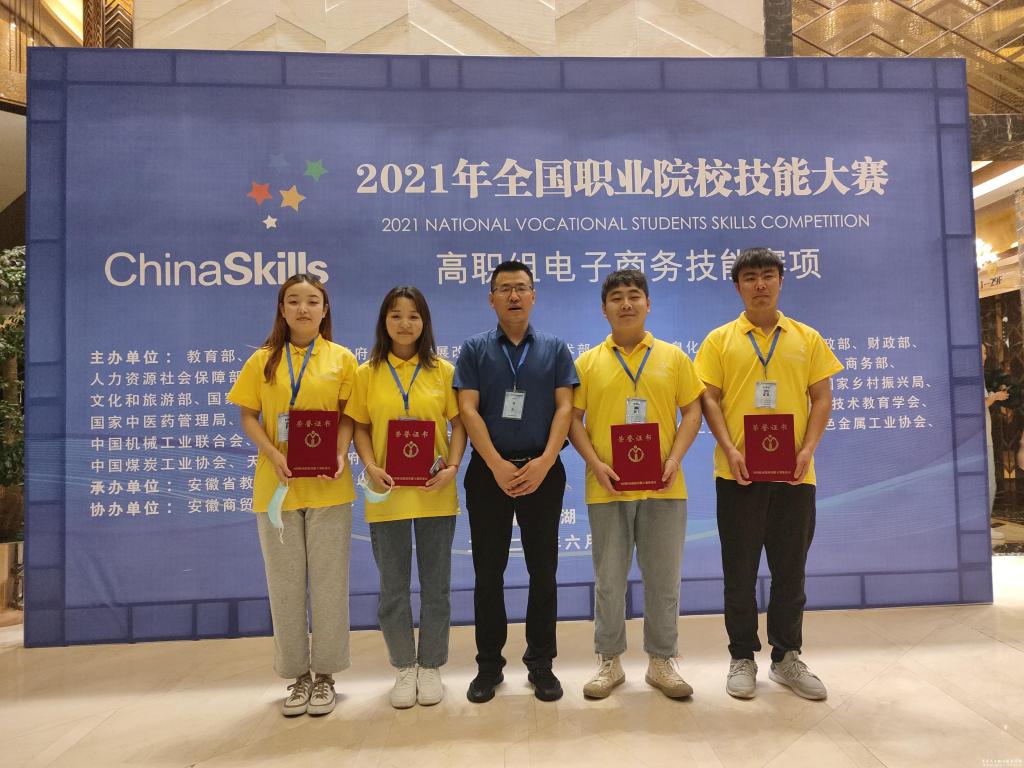 6月18日至6月19日,2021年全国职业院校技能大赛高职组“电子商务”技能赛项在安徽商贸职业技术学院举行,我校电子商务专业4名学子组成的代表队,代表甘肃省参加本次大赛,喜获该赛项团体三等奖。