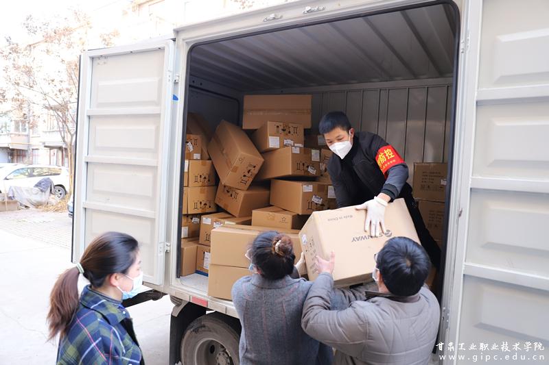 捐赠物资在防疫办、保卫处及校团委志愿者的帮助下,以最快的速度完成了物资的卸货、消杀、清点工作。